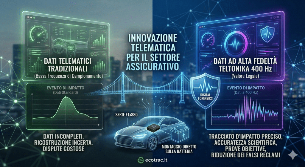 - Accelerometro a 400 Hz (Legal-Grade Data): A differenza dei sensori convenzionali, questa frequenza di campionamento cattura ogni millesimo di secondo dell’impatto. Questa precisione è il confine che separa una disputa legale incerta da una vittoria basata su prove tecniche, permettendo di rilevare anche le accelerazioni più brevi e veloci.
